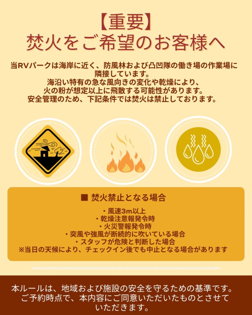 ※焚き火利用の場合は防火シートレンタル有(1,000円) - 強風時は焚き火・火気の使用を中止してください。